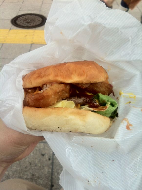ビーフパティの他に、オニオンリングとベーコンとチーズが入った贅沢バーガー!