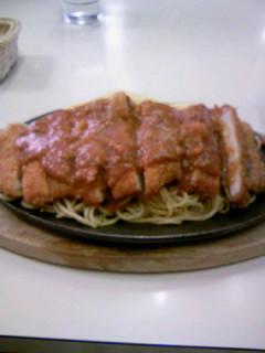 その上にゆでたてスパゲッティ、とんかつ、ミートソースをたっぷりかけてある逸品。