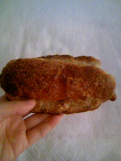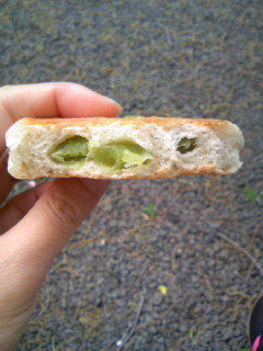 プレーンなパンの上に、ヘーゼルナッツたっぷりのクッキー生地をかけて焼いてあります。