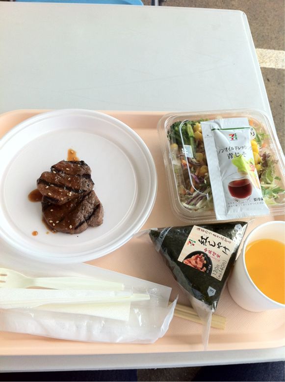 牛ヒレ網焼き、野菜サラダ、鮭おにぎり、オレンジジュース。