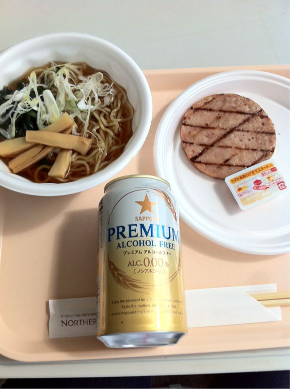 しょうゆラーメン、ボローニャソーセージ網焼き、完走賞のノンアルコールビール。
