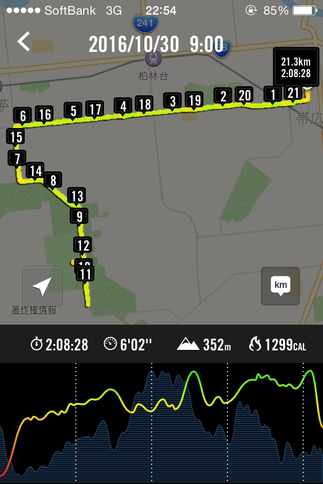 (途中2度の落ち込みは、長い上り坂と強い向かい風の所です)