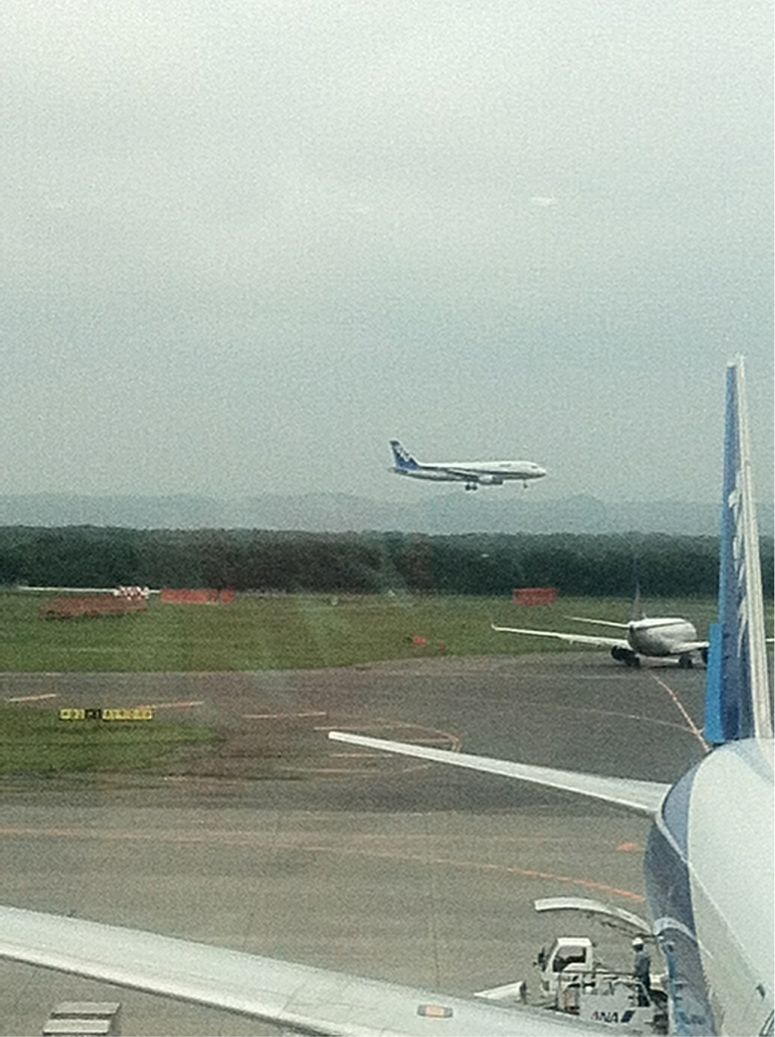 着陸しようとしているANA機と、離陸のため滑走路に向かうJAL機の後ろ姿。